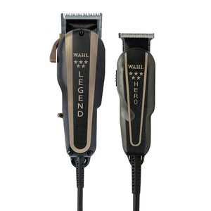 Le Barber Combo réunit deux excellents produits capillaires dans un seul pack pratique. La Legend est une tondeuse rapide et silencieuse, dotée d'une technologie de lame « crunch » avec une forme conique améliorée pour des coupes nettes et des portées plus longues. Associée à cet outil de décoloration ultime, la Hero est une tondeuse miniature à lame en T, dotée de toute la puissance d'une tondeuse classique et idéale pour les lignes et les dessins. Pour votre confort, la Wahl Le coffret barbier professionnel 5 étoiles est fourni avec tous les accessoires nécessaires. Il est proposé dans un coloris exclusif noir et or pour une expérience encore plus exceptionnelle. Choisissez votre nouveau duo barbier préféré dès aujourd'hui !