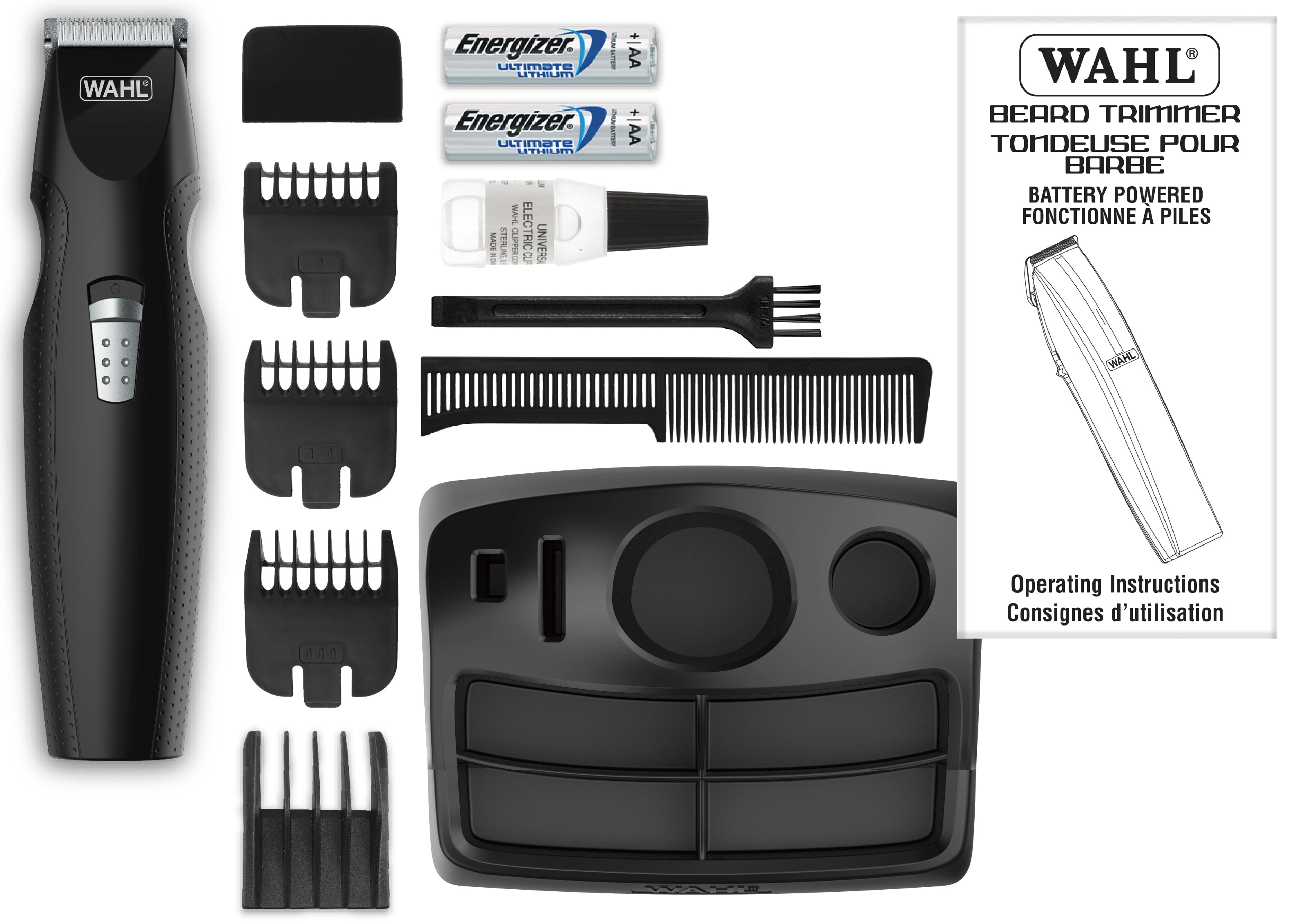 Comprend 3 accessoires de coupe : guide de chaume (1/16"), guide de barbe courte (1/8"), guide de barbe moyenne (3/16"). Ces accessoires sont idéaux pour estomper, effiler et définir les barbes, ainsi que pour pour obtenir un aspect de chaume « de près » autour du visage. 2 piles AA au lithium Energizer incluses (des piles au lithium ou alcalines peuvent être utilisées pour le remplacement).