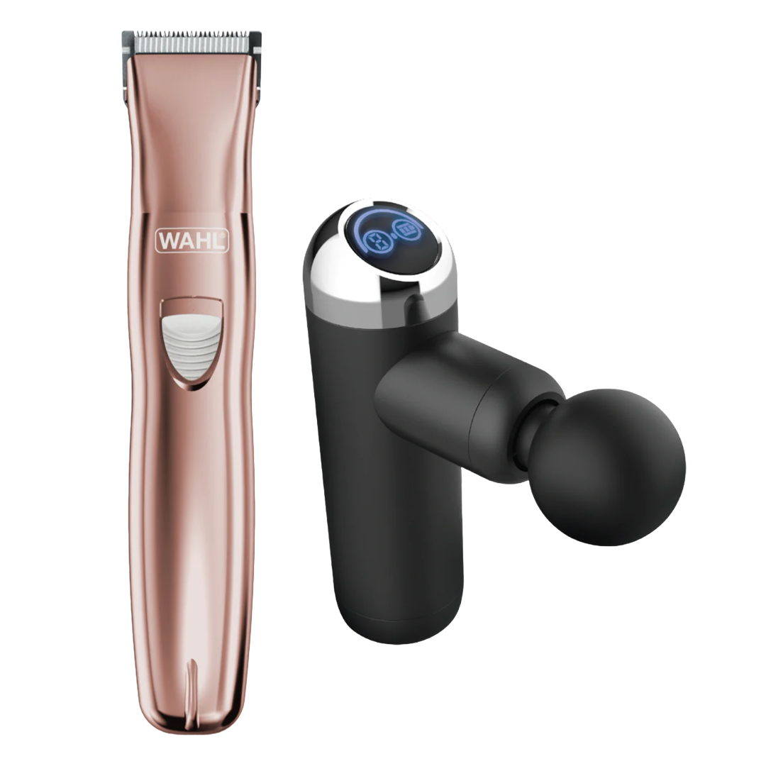 The Glow & Go Bundle is your ultimate self-care companion, designed for both relaxation and precision grooming. This set includes a powerful mini massage gun to relieve muscle tension and a versatile ladies grooming kit for smooth, irritation-free hair removal.