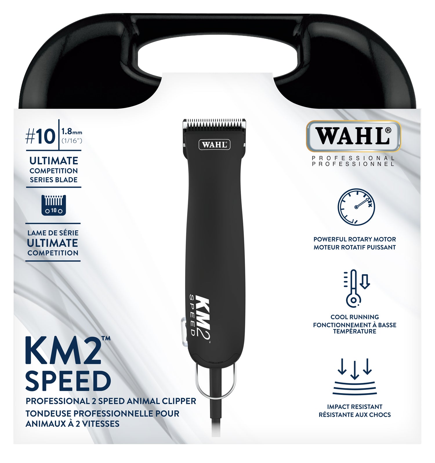 › Powerful rotary motor with 2 speeds: Low speed: 3,000 SPM. High speed: 3,500 SPM. › High torque clipper cuts even the thickest coat. › Pivot gear system reduces vibration. › Long strokes create more cutting surface per stroke. › Sealed motor requires no maintenance, is fan cooled and impact and chemical resistant. › Blades stay secure with locking blade hinge. › The KM2 works with both Competition Series and Ultimate Series Blades.