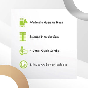 Use the convenient guide comb to trim 4 different lengths 2mm, 3mm, 4mm, & 5mm or completely remove hair by using trimmer without a guide comb. For easy clean up rinse the blade under water. The Extreme Grip trimmer comes with a silicone housing that protects it from everyday bumps and offers non‐slip grip while in use. When done, simply store the trimmer with accessories in the soft case.