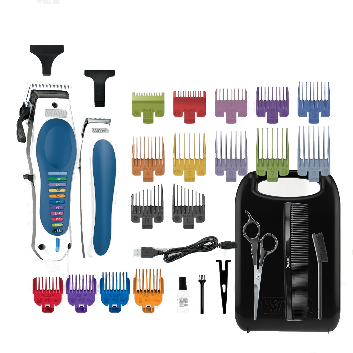 Featuring Wahl’s signature color-coded guide system, the kit includes 10 color-coded attachment guards (1/16”–1”) and a matching color key, eliminating guesswork when choosing lengths. Self-sharpening precision blades cut through thick hair smoothly, while the adjustable taper lever makes blending and fading effortless.
